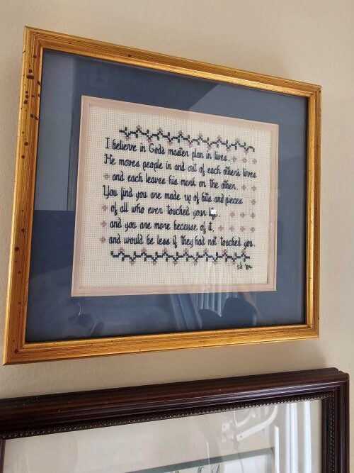 On the trip this summer, we stopped at Dear Mother-in-Law’s home on the way to Middle of Nowhere, PA (reunion venue, and no, not the official name of the town). DMIL was a champion cross-stitcher in her day. This framed one has probably always been hanging in her house, but on this trip, I gave it special consideration.